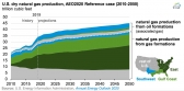 EIA expects dry natural gas production to total 34 trillion cubic feet (Tcf) in 2019 once the final data is in. In the AEO2020 reference case, EIA projects that U.S. dry natural gas production will reach 45 Tcf by 2050. Production growth results largely from continued development of tight and shale resources in the East, Gulf Coast, and Southwest regions, which more than offsets production declines in other regions. Dry natural gas production from these three regions accounted for 68 percent of total U.S. dry natural gas production in 2019 and, in the reference case, 78 percent of dry natural gas production in 2050.