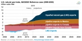 In the reference case, both U.S. natural gas exports by pipeline and U.S. LNG exports continue to grow through 2030. LNG exports account for most of the export growth because more LNG export facilities are becoming operational and more projects are under construction. In the reference case, EIA projects that LNG exports will almost triple, from 1.7 Tcf in 2019 to 5.8 Tcf in 2030, the equivalent of nearly 16 billion cubic feet per day (Bcf/d). LNG exports remain at this level through 2050 as U.S.-sourced LNG becomes less competitive in world markets and as more countries become global LNG suppliers.