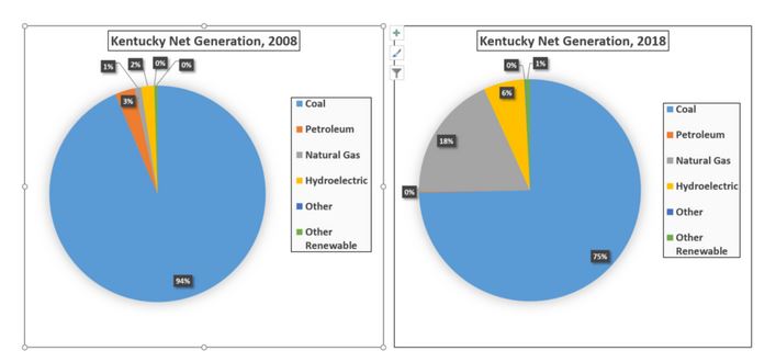 At the same time, Kentucky is using less coal power. A decade ago, 94 percent of Kentucky’s electricity came from coal. Today, it’s at around 75 percent, with the difference made up mostly by natural gas and a small increase in hydroelectric generation.