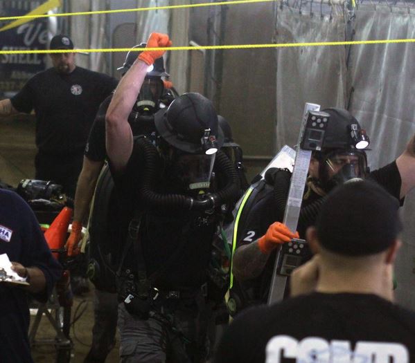 Even though it is a competitive simulation, the exertion is real. With temperatures rising into the 80s, the breathing apparatus and safety gear the competitors have to wear and carry makes for a hot, sweaty morning.