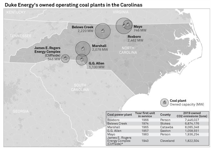 An S&P Global Market Intelligence analysis shows Duke Energy operates about 9,000 MW of coal-fired generation in the Carolinas. The 2,462-MW Roxboro, 2,220-MW Belews Creek and 2,078-MW Marshall coal plants are in North Carolina and are among Duke Energy’s 10 largest operating plants in the region.