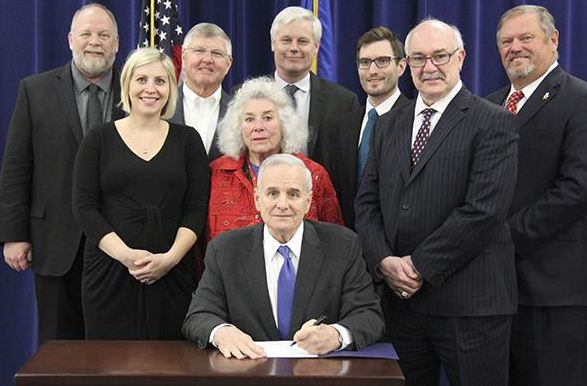 Gov. Mark Dayton signed the unemployment benefits bill Thursday as northern Minnesota lawmakers looked on.