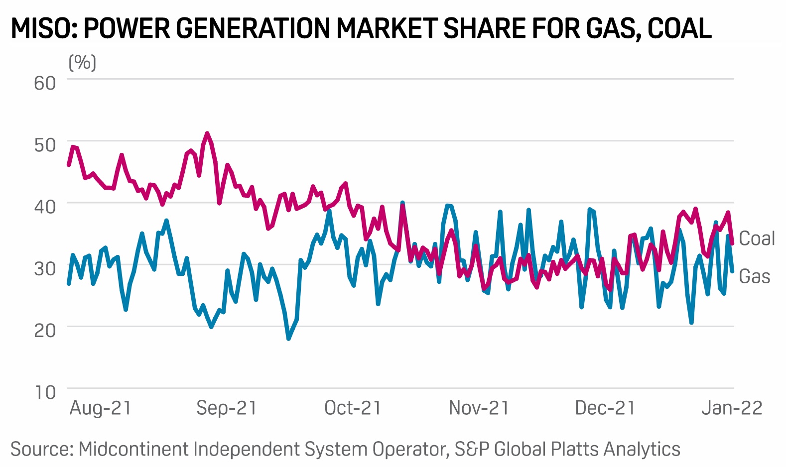 The recent uptick in coal generation across MISO follows a prolonged contraction in market share for the fuel from mid-October through late December 2021. Over the roughly 10-week period, both coal and natural gas accounted for about 30 percent to 31 percent of total power generation in MISO, respectively.